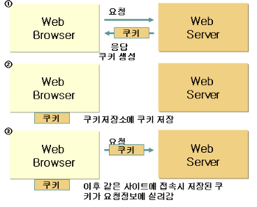 - 쿠키 기술의 사용방법: 이미 저장되어 있는 쿠키의 값을 가져올 때에는 request 객체를 사용하여 가져옵니다. 쿠키를 설정하고자 할 때는 response 객체를 사용해서 쿠키의 값을 설정할 수 있습니다.