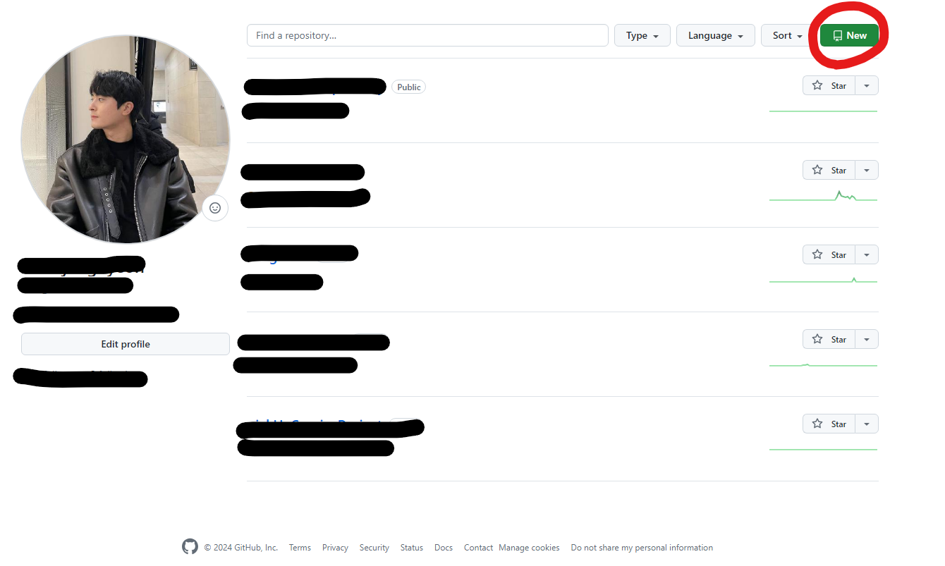 1) GitHub 로그인 -> 우측 자신의 이미지 아이콘 클릭 후 -> Your Repositories 클릭