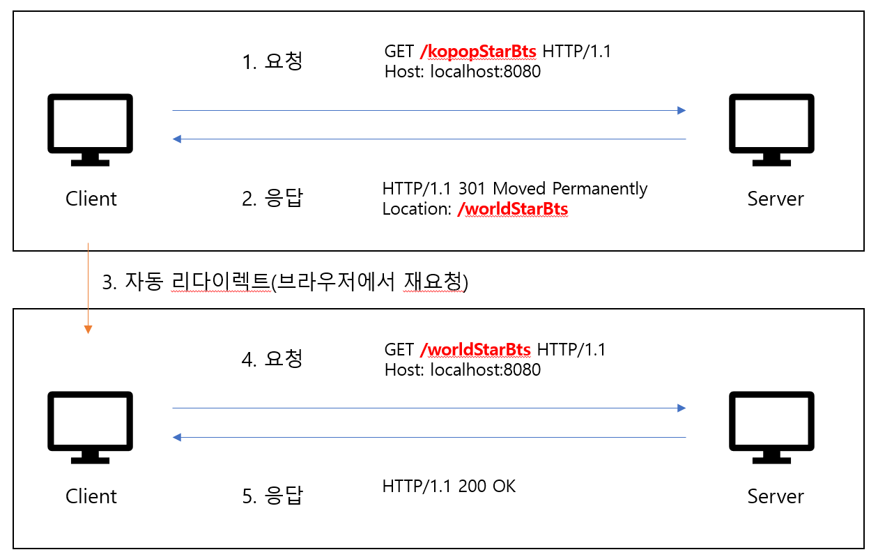 2. 서버에서 /kpopStarBts 라는 url은 /worldStarBts 라고 바꼈어라고 클라이언트에게 보내줌