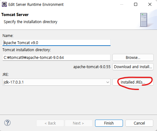 방법: 상단의 Window -> preferences -> Server -> Runtime Environment