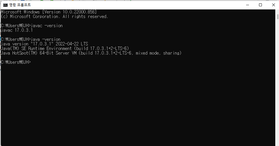 확인방법: 명령 프롬프트(윈도우키를 누르고 cmd 치면 나온다.)를 키고 java -version을 치면 현재 자신의 자바 버전이 나온다.