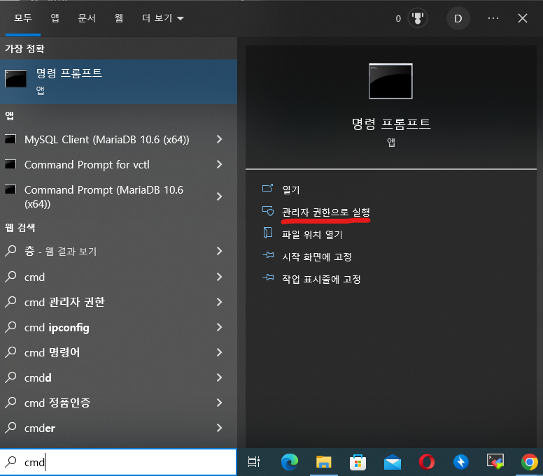 1. 윈도우(키보드) 버튼 클릭 후 -> 'cmd' 입력 후 관리자 권한으로 실행합니다.