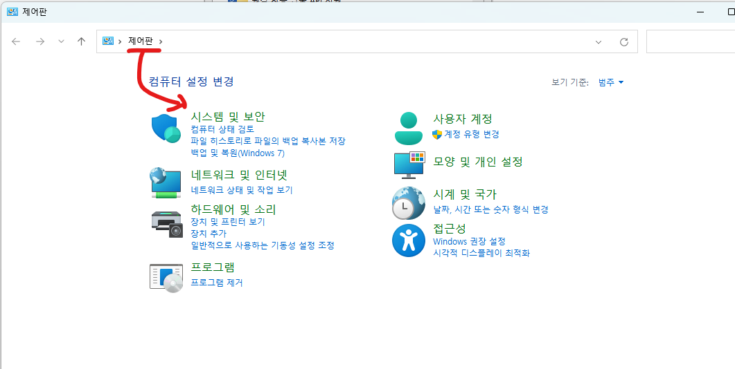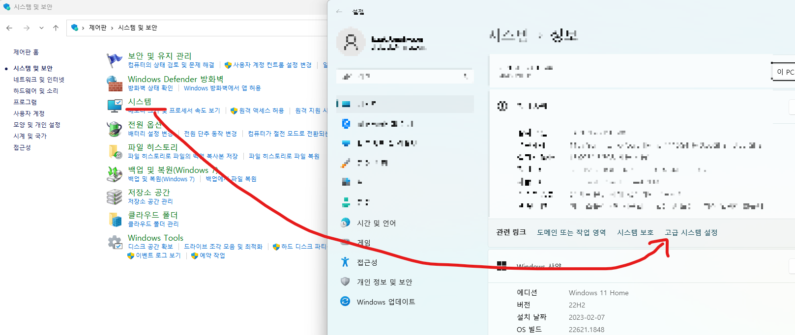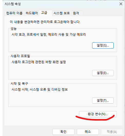 1) 제어판 -> 시스템 및 보안 -> 시스템 -> 시스템 정보 -> 고급 시스템 설정