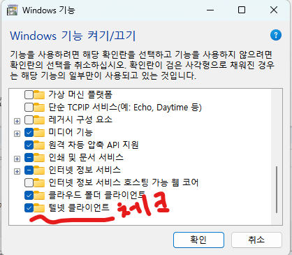 2. Windows 기능 추가를 통해 Telnet 클라이언트를 설치해도 문제가 해결되지 않았다면..