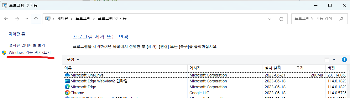 2) "Windows 기능 켜기/끄기"를 선택