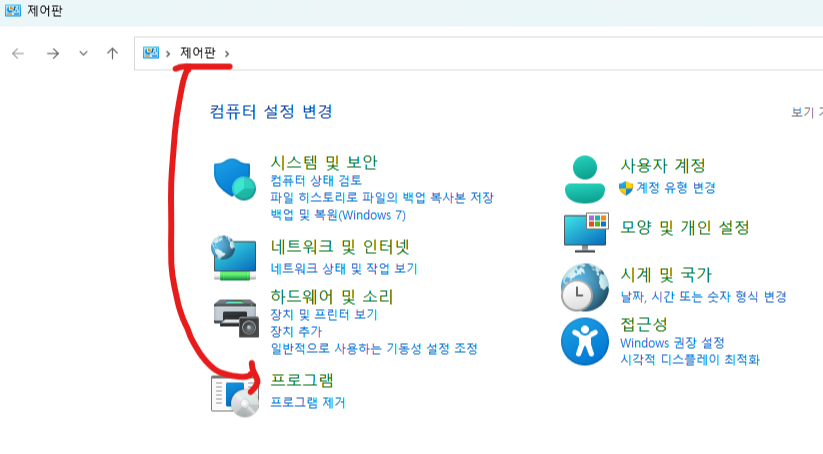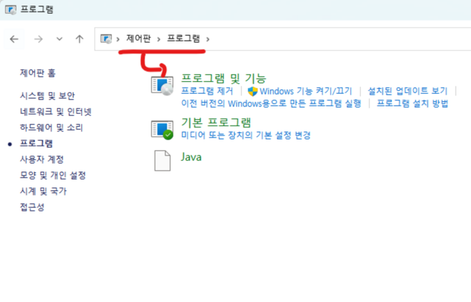 1) 제어판에서 "프로그램 및 기능" 또는 "애플리케이션 및 기능"을 연다